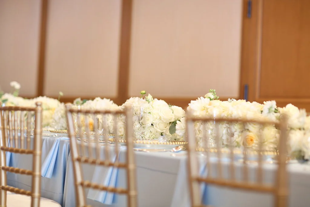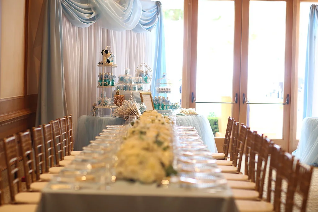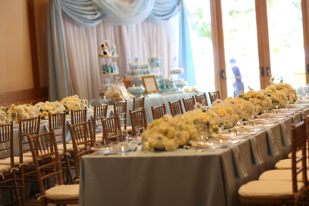 Once we had our location, it was time for a theme. I did want to stay with traditional blue but not really any sort of themey theme- like cars or trucks. We decided on light blue, white and gold, with just a ton of white flowers. I wanted long tables (we wound up with 2) with gold chairs-- for the last few parties I have thrown, I've used this set up and its nice to have everyone sitting all together instead of at multiple round tables. For linens, I went to WildFlower Linens and oh my goodness! I went gaga over this place- it made me want to get married like, 5 more times so that I could use all of the fabulous designs they have! We used light blue silk with tulle and I know, this sounds fluffy and girly and not boy like but I didn't mind a bit! The more tulle and silk, the better I say! :)