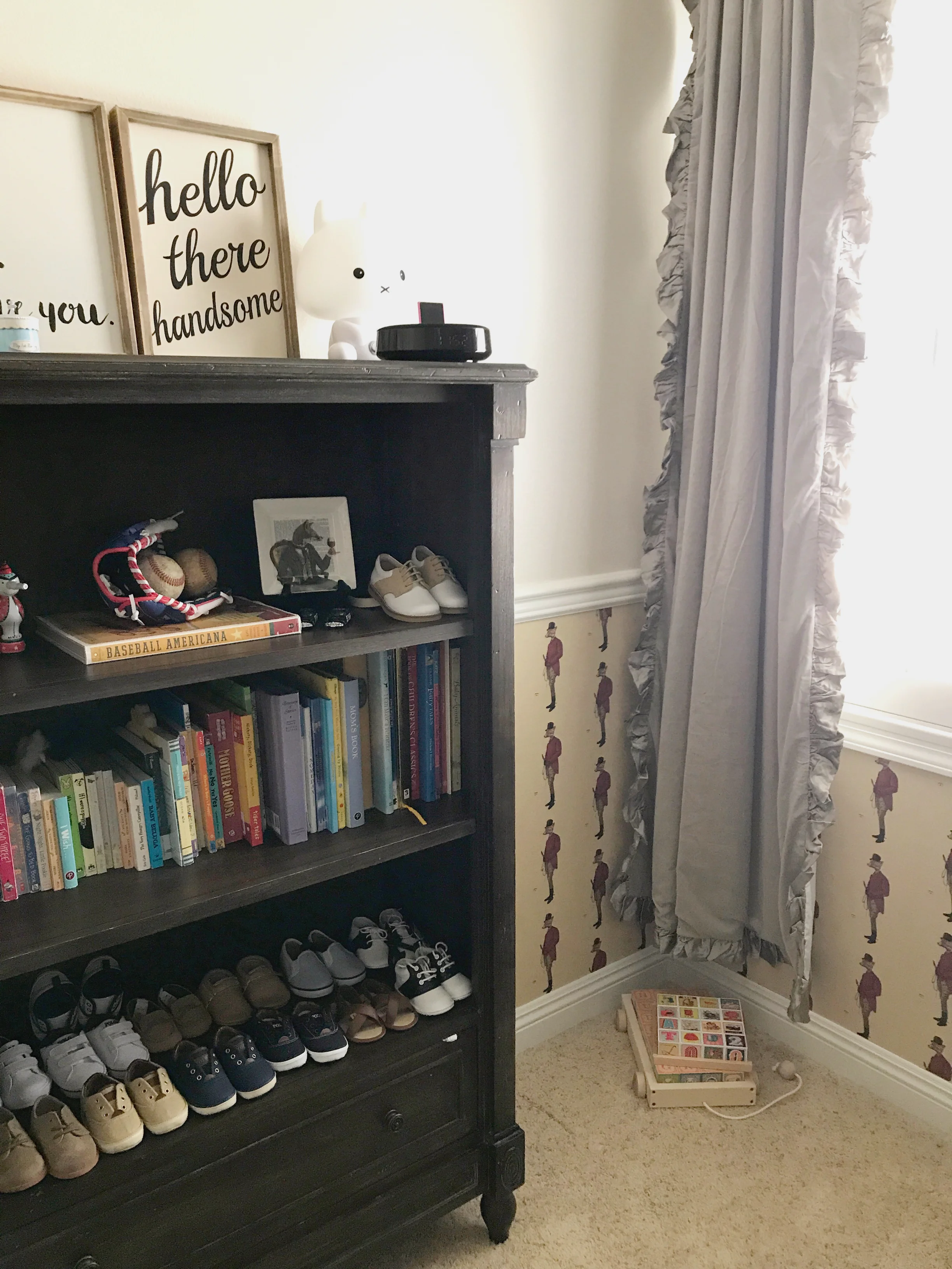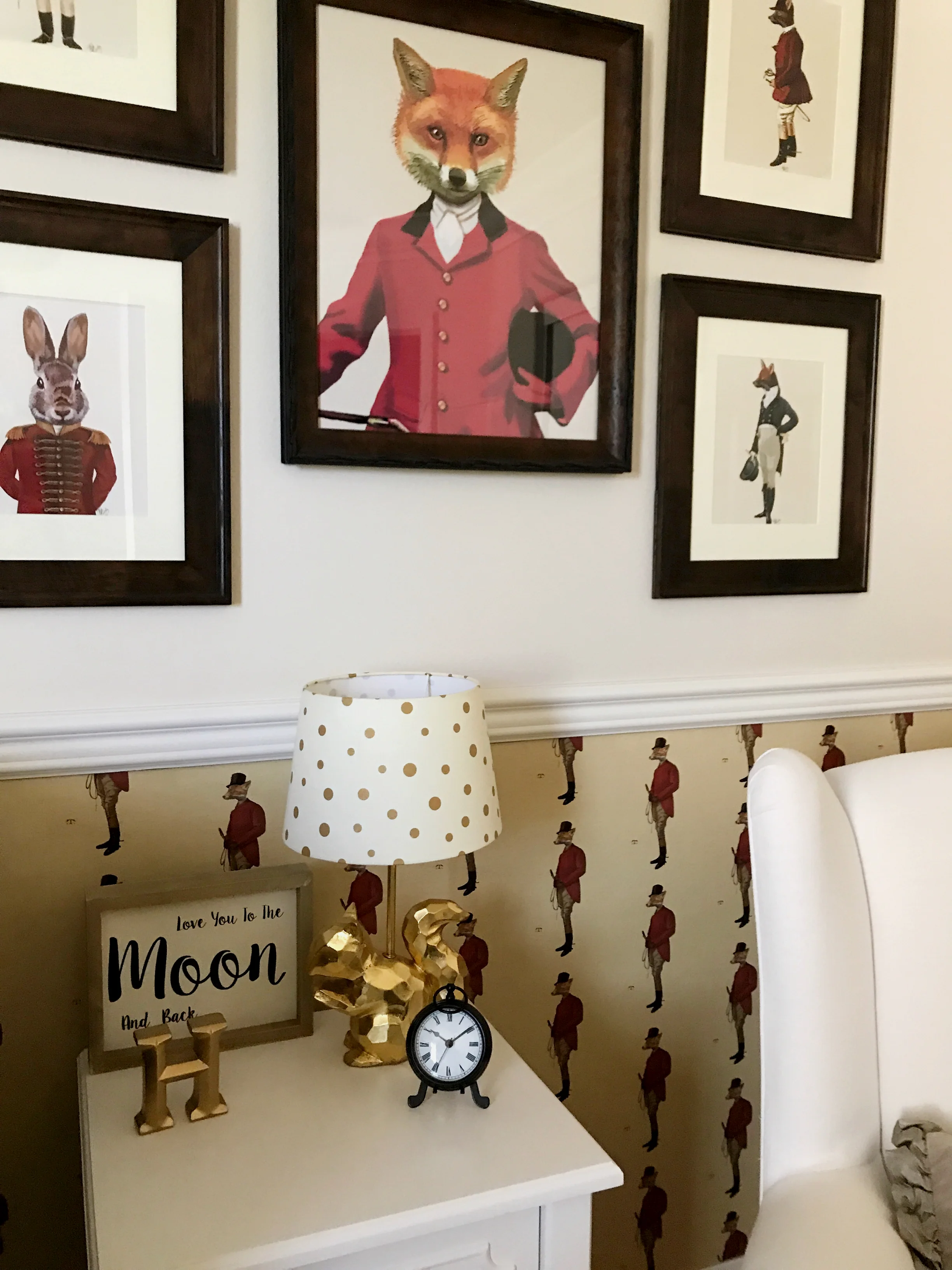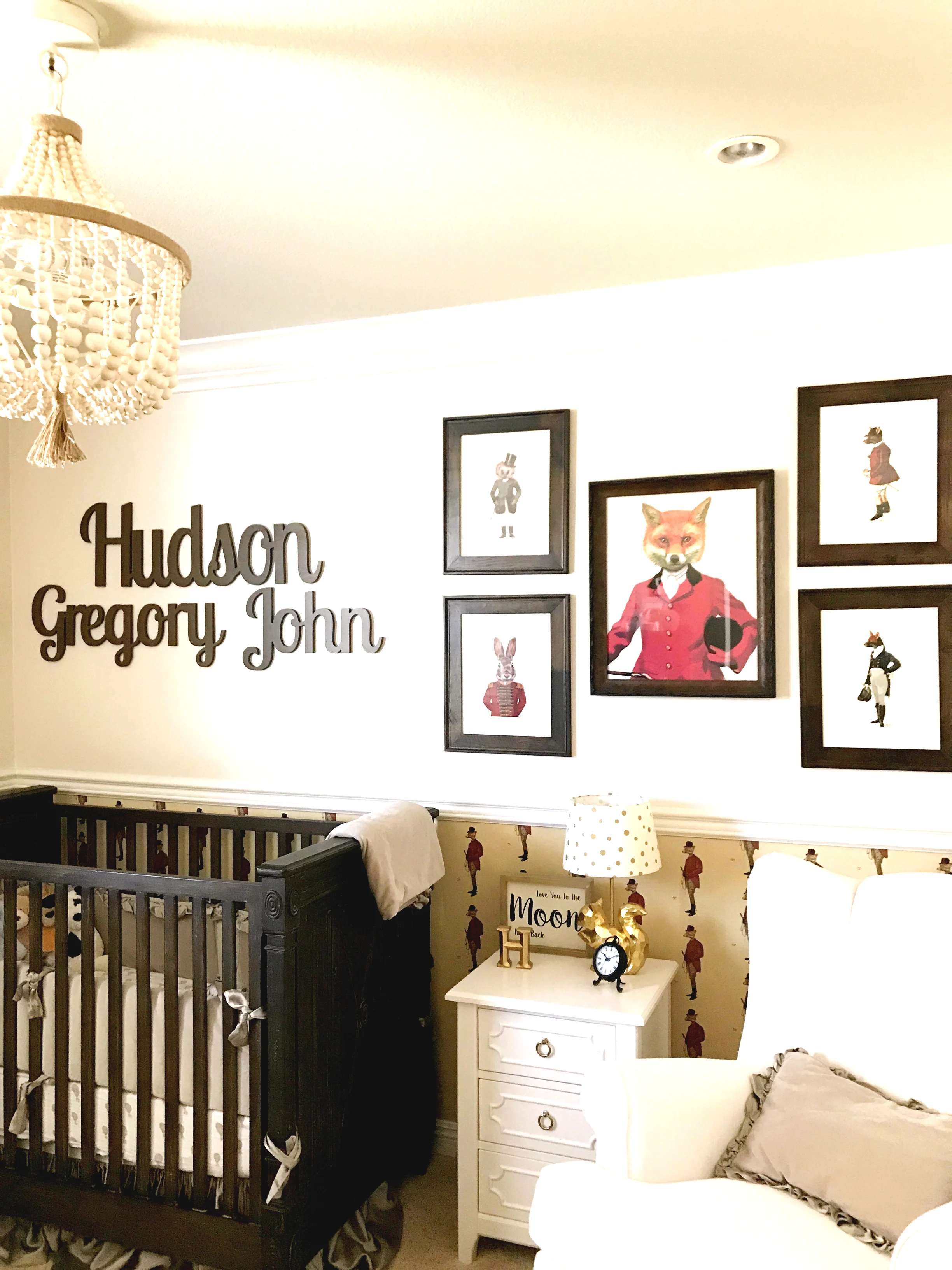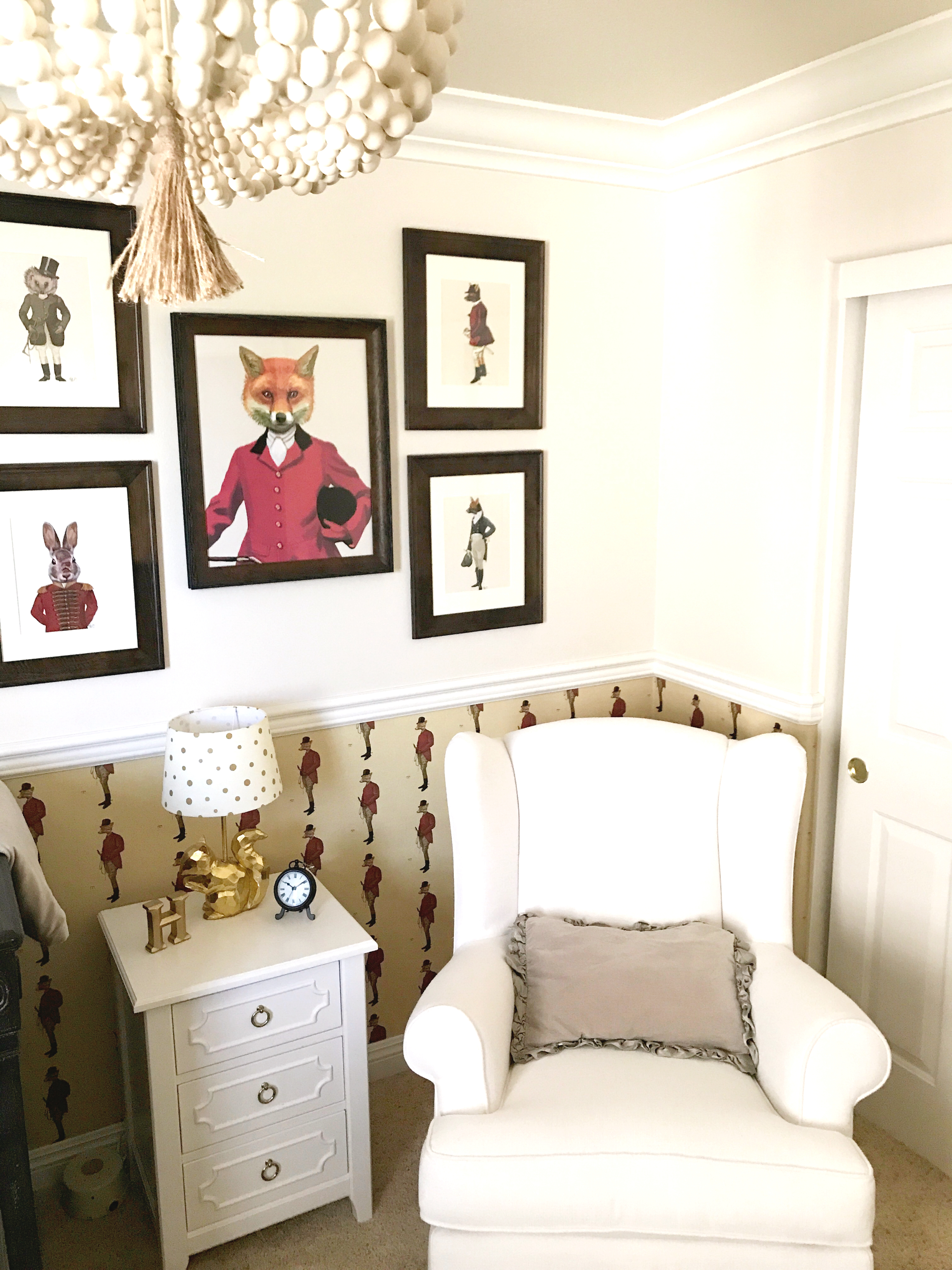 {Blogged over World of Dance. JLO. I mean...} Oh my gosh, I've wanted to do a room post for the past 10 months but I kept thinking "His room isn't finished! As soon as I get his rug/sconce/art ordered, then I will". Well, that might never happen, soooo here we go! I've written about this before a bit here, but everything about having a boy was an unknown concept to me. Our house was nothing but girl stuff and I hadn't ever thought about being a boy mom. What do they wear? What do they play with? What are they NAMED?? (naming this poor boy was the biggest struggle for us!) I was excited to decorate his nursery, but I had zero ideas as to a theme. I am not really a person who gets ideas from Pinterest. I like to just sort of ruminate on things, and eventually, ideas will come to me. Its different for me every time but something will be the trigger for a theme and I just build around it-- dinner parties, birthday parties, etc- I just need one little bit of inspiration. I knew I didn't want traditional cars or firetrucks or sports as a nursery theme-- I figure that when he is two or three, we will redo his room to fit whatever cartoon or sports team he is into at that time (and I am positive his Daddy will make sure its Cubs or Blackhawks related and if we have a better team at the time, mama is going to vote for purple and gold!) And I am sort of wallpaper obsessed right now and I knew I wanted to wallpaper his room. At first, I wanted a mural (I actually ordered this one) and I was thinking about doing a vintage map theme (another obsession of mine--I still think this would be the cutest theme!) I love ruffley, silky bedding for nurseries and I was deep into planning with this paper (It's called the Bunny Prince- what's not to love?) when I stumbled upon the most perfect theme for me. I love animals and anything horse/polo/English hunting lodge related. And when I saw this one, I think I might have squealed a little! It was like that moment when you see your wedding dress for the first time, (or a new handbag)-- that "THIS IS THE ONE moment! I'm not sure everyone was initially on board with my fox-wearing-a-jacket-idea *cough husband and mom cough* but the room has come together. I still need a little more art and some baskets for his shoes and a little more organization in his closet and maybe a little toy chest but this list will never end and since I love his room... here we go!