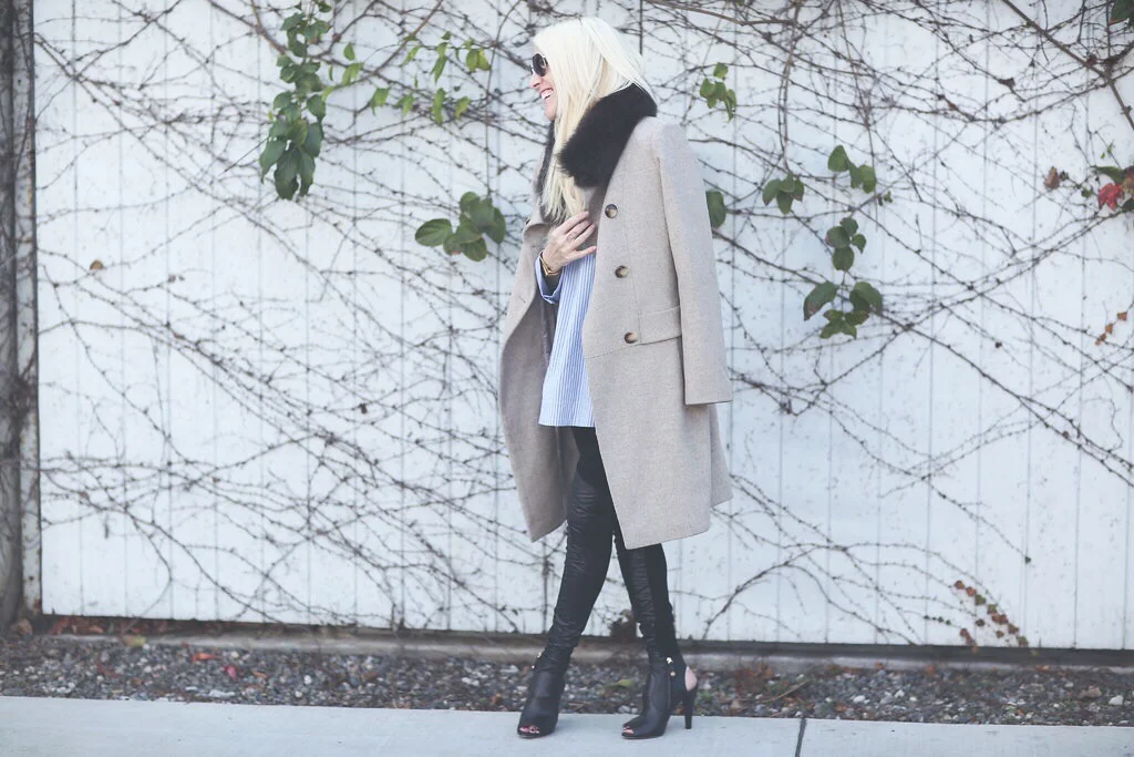 I haven't been feeling the work vibe lately- anyone else ever get this way? When you are just not in the mood to dress up? Maybe it's the dreary, unusual Southern California weather we've been having, maybe its the post-holiday blues-- I don't know-- but I have not been climbing into any chic sheath dresses or pant suits for the office lately.  Enter my friend the leather legging.  Paired with a longer shirt (like the pin stripe one I am wearing) and even with a pull over sweater on top- it is the perfect business-casual, "I'm not feeling it right now" look.  The gold accents and the boots help to keep it on the businessy side of business casual and still a little dressy.  And this coat...oh how I love this coat.   I have to tell you the story of this coat.   So, a few years ago, one of my dear friends and I head to New York during December to meet with clients.   It was around 80 degrees in Southern California at the time and I am not a good packer to begin with, so the last thing I was thinking of was a coat (note: it was COLD in NYC!)   As we were sitting on the plane together, she says " You shouldn't have packed your coat, because you are going to need to put it on as soon as we land." And my stomach dropped and I said " Oh my gosh.  It's still sitting on my dining room table at home."  Thankfully, I went from airport to hotel without getting frost-bite but the next day, we headed out early to get me a coat.  And instead of heading to a department store, we walked down a block or two, and like it always happens in magical NYC, found a little boutique that only sold coats!  I saw this one and fell in love but I was thinking -- its not practical, its cashmere and I will get it all dirty becasue its such a light color--but then I thought " Heck with it! I'm in New York City and I am just doing it!" And I did. And I have been madly in love ever since!  The morale to this story?  If you love it, you will never regret it!  Thank you for stopping by, dear reader.  Sweetly, Michelle